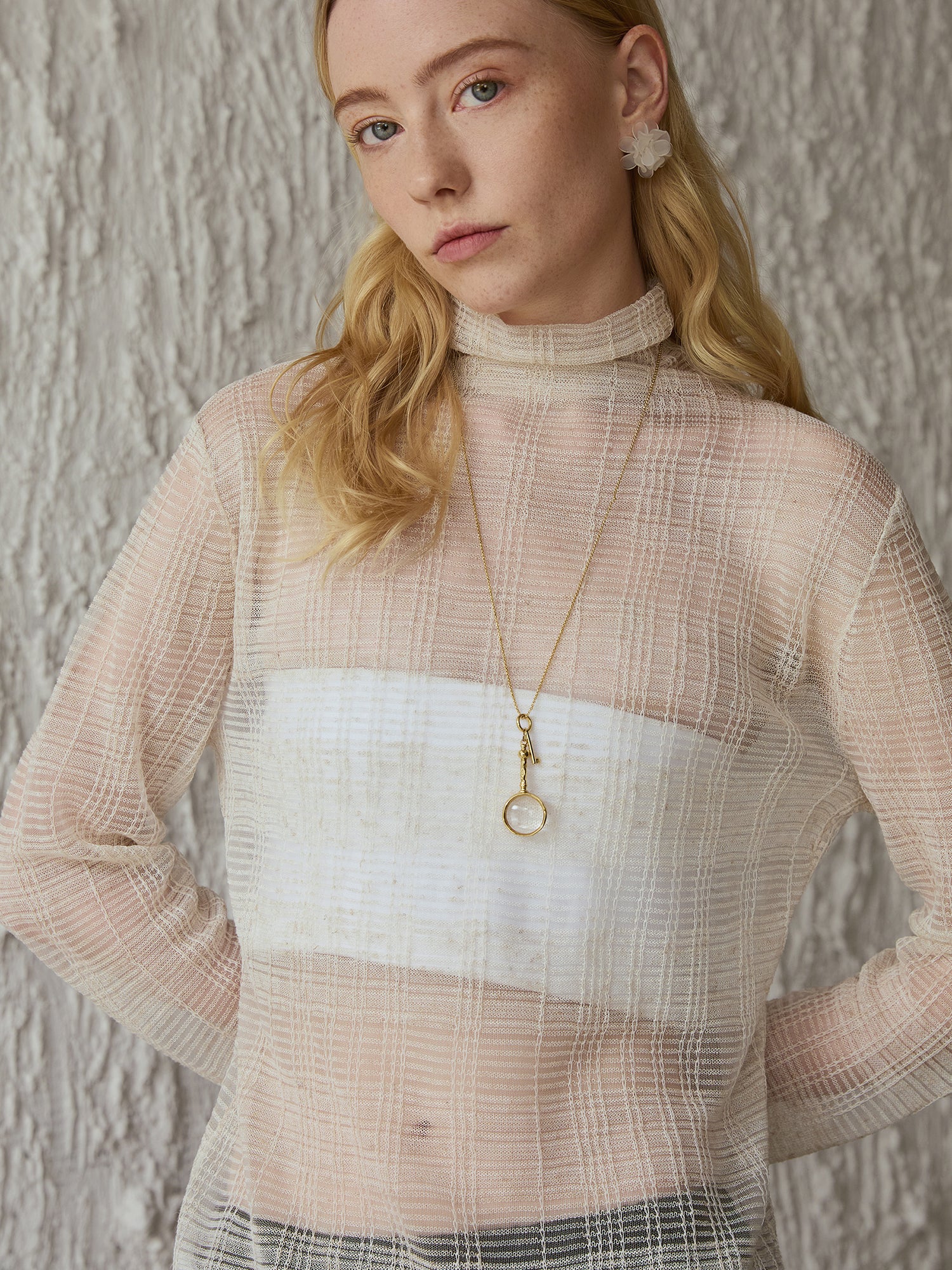 A feather-light, semi-sheer mock-neck top cut from a breathable viscose–linen blend with a soft, grid-textured finish. It skims the body without clinging and layers effortlessly under blazers, slip dresses or knits. Long sleeves and a gently draped neck add polish while keeping you cool. An easy, refined base layer for transitional days and night-out looks.
