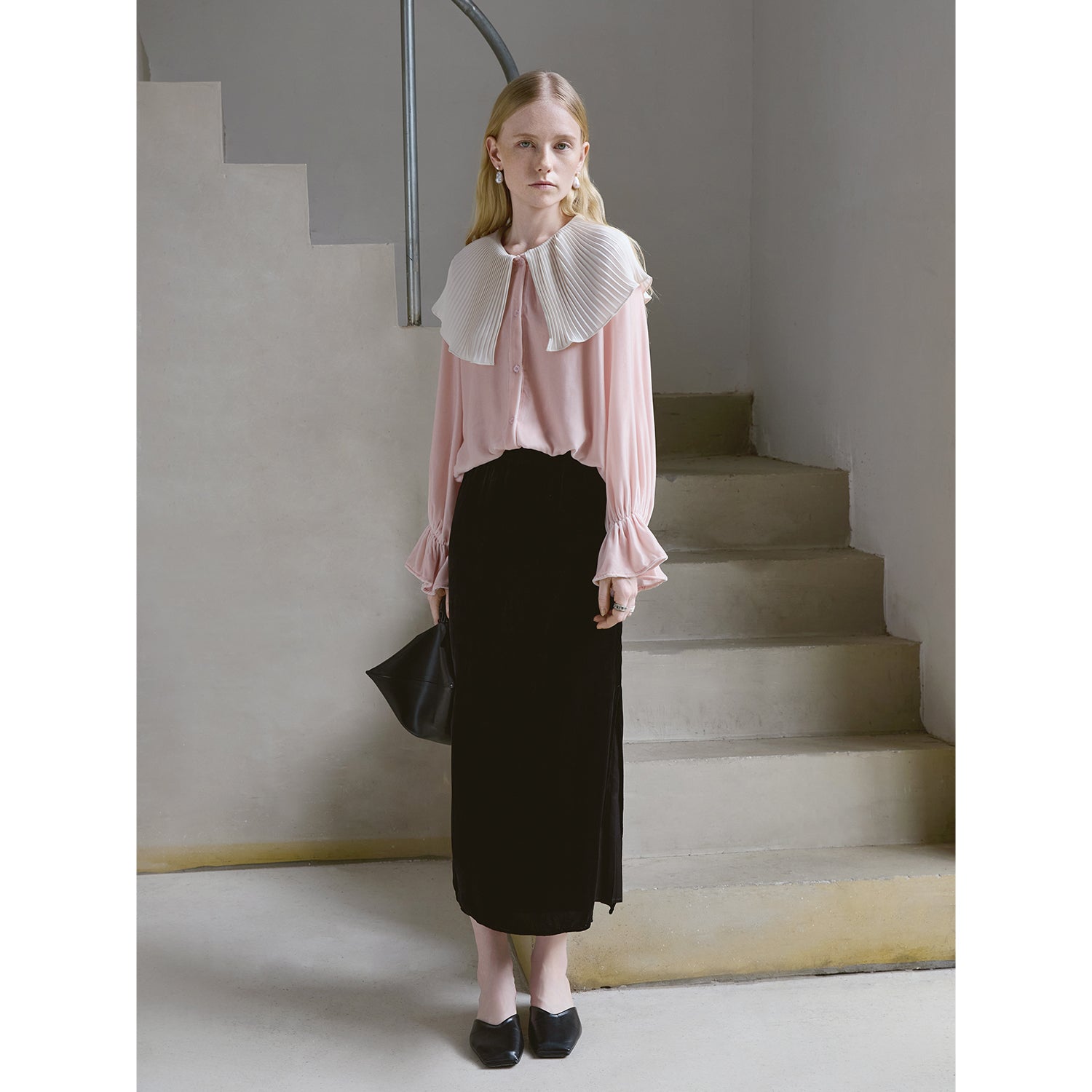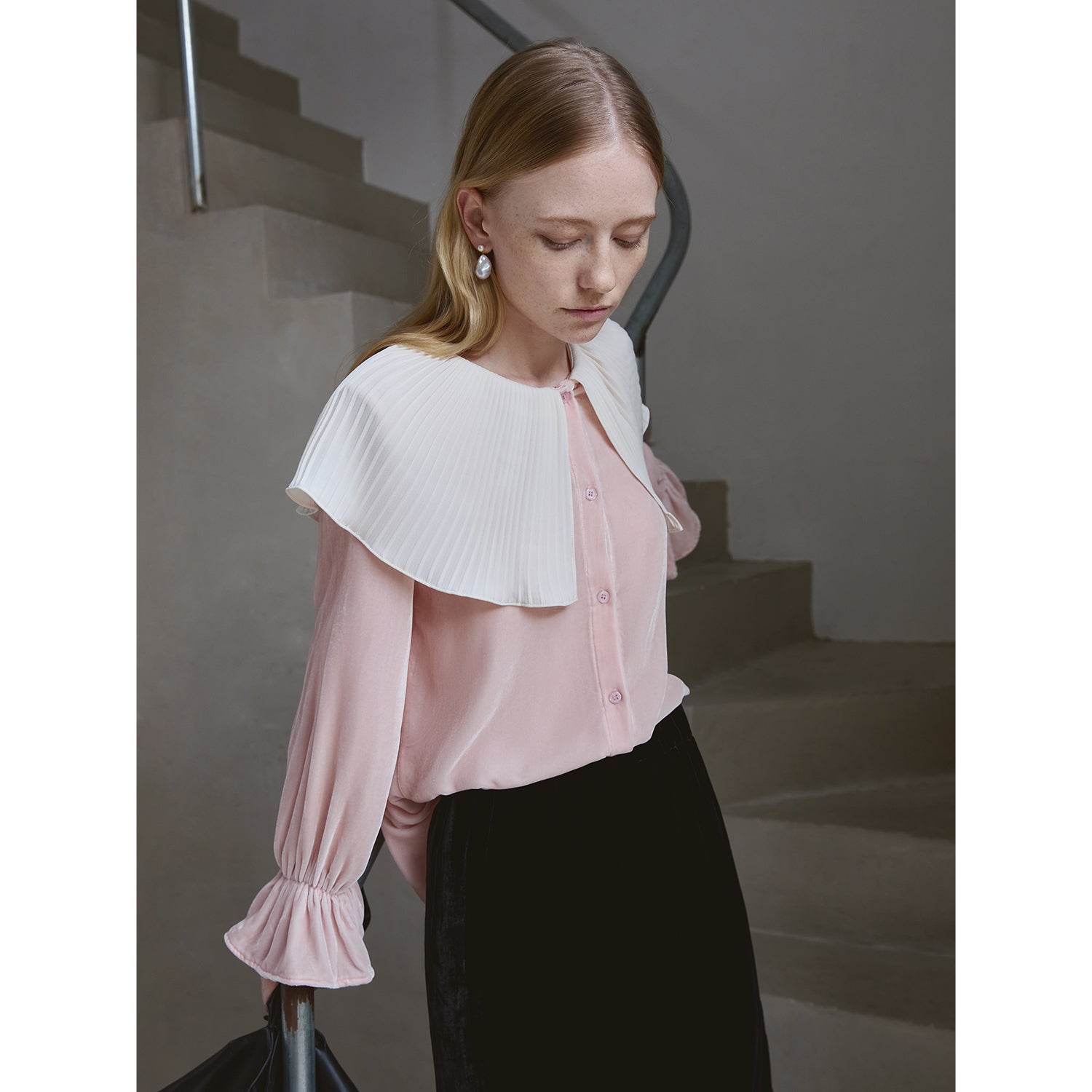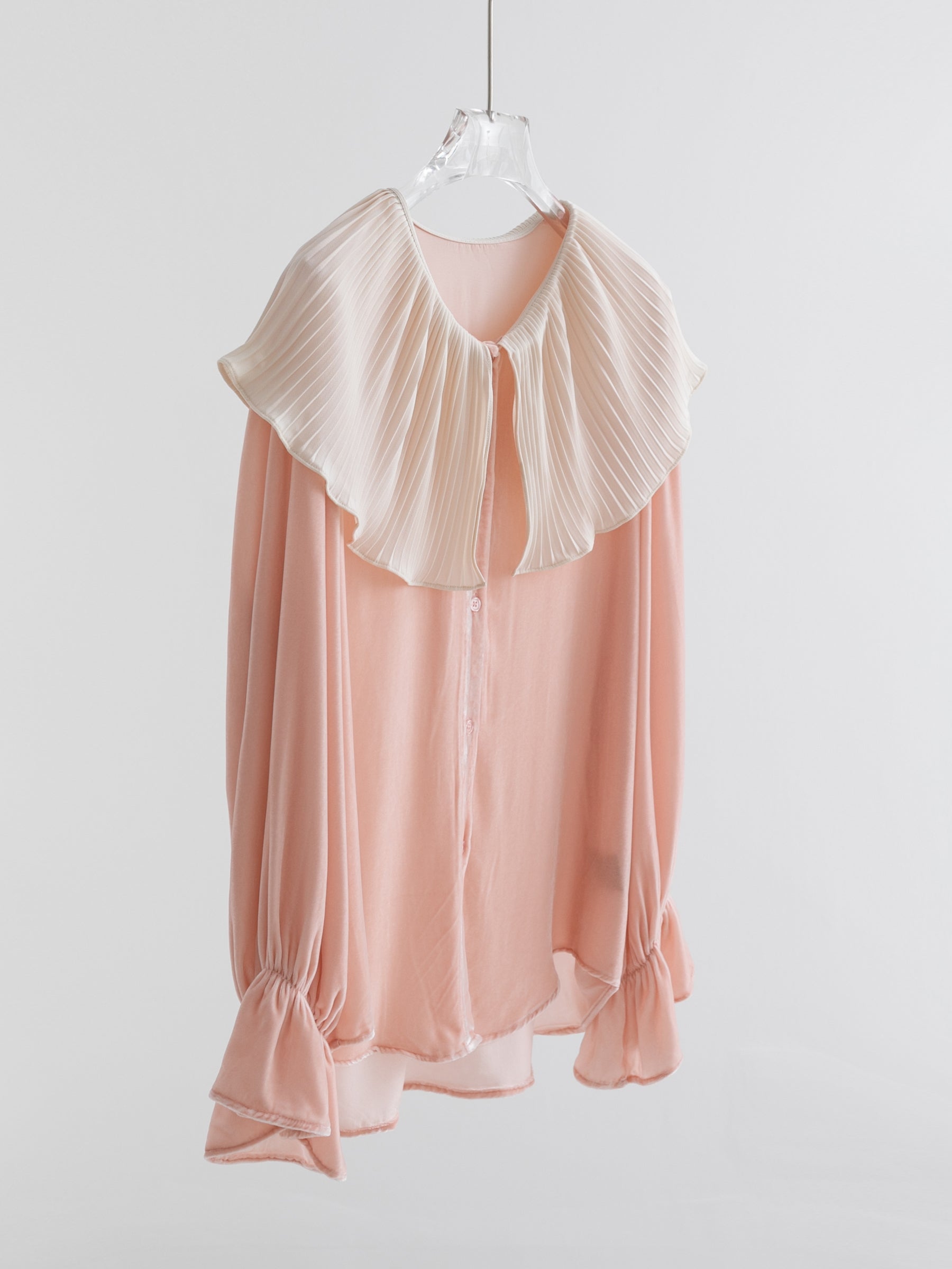 This elegant long-sleeve blouse is crafted from soft chiffon fabric in a gentle pink tone, offering both comfort and sophistication.