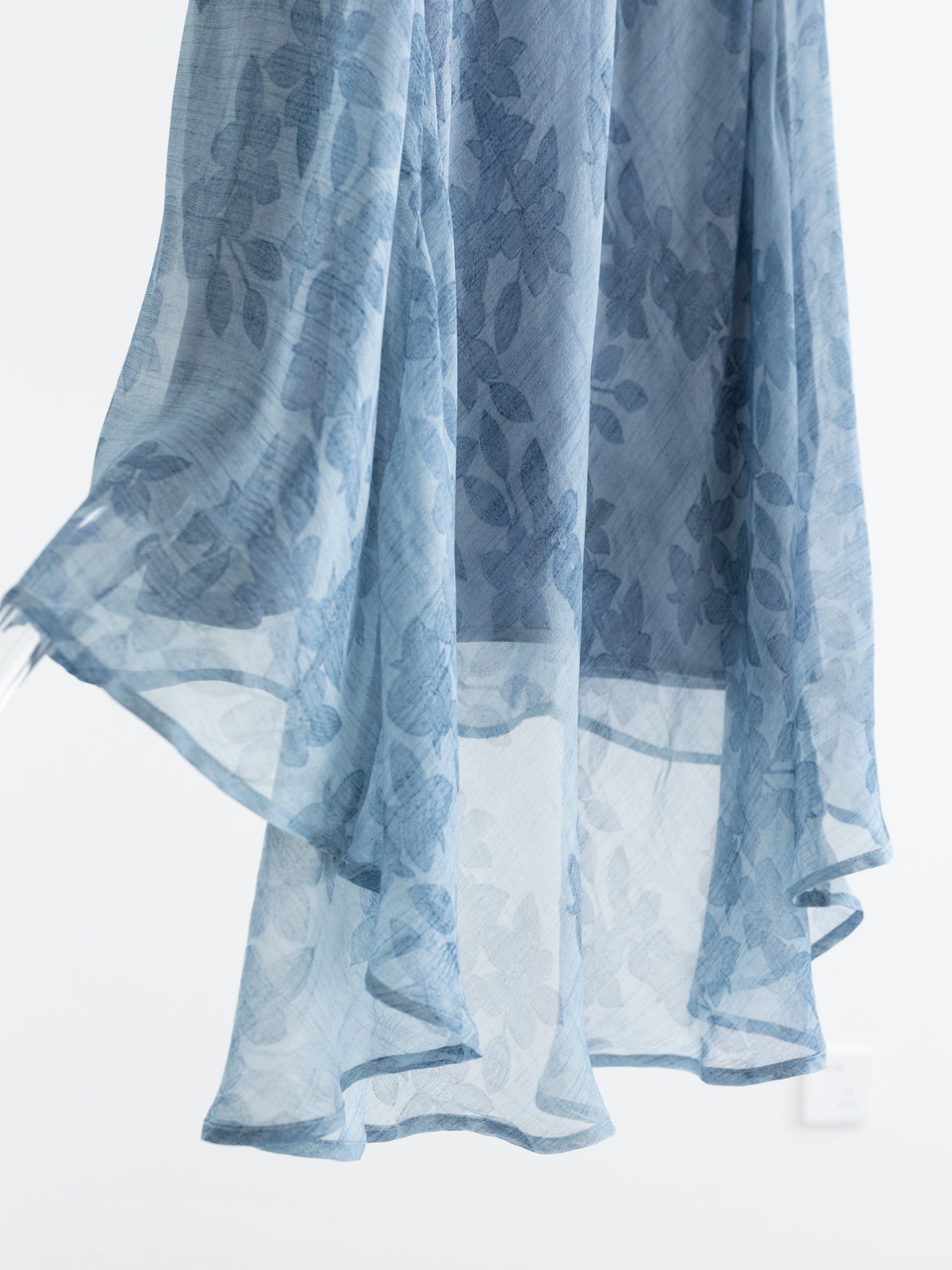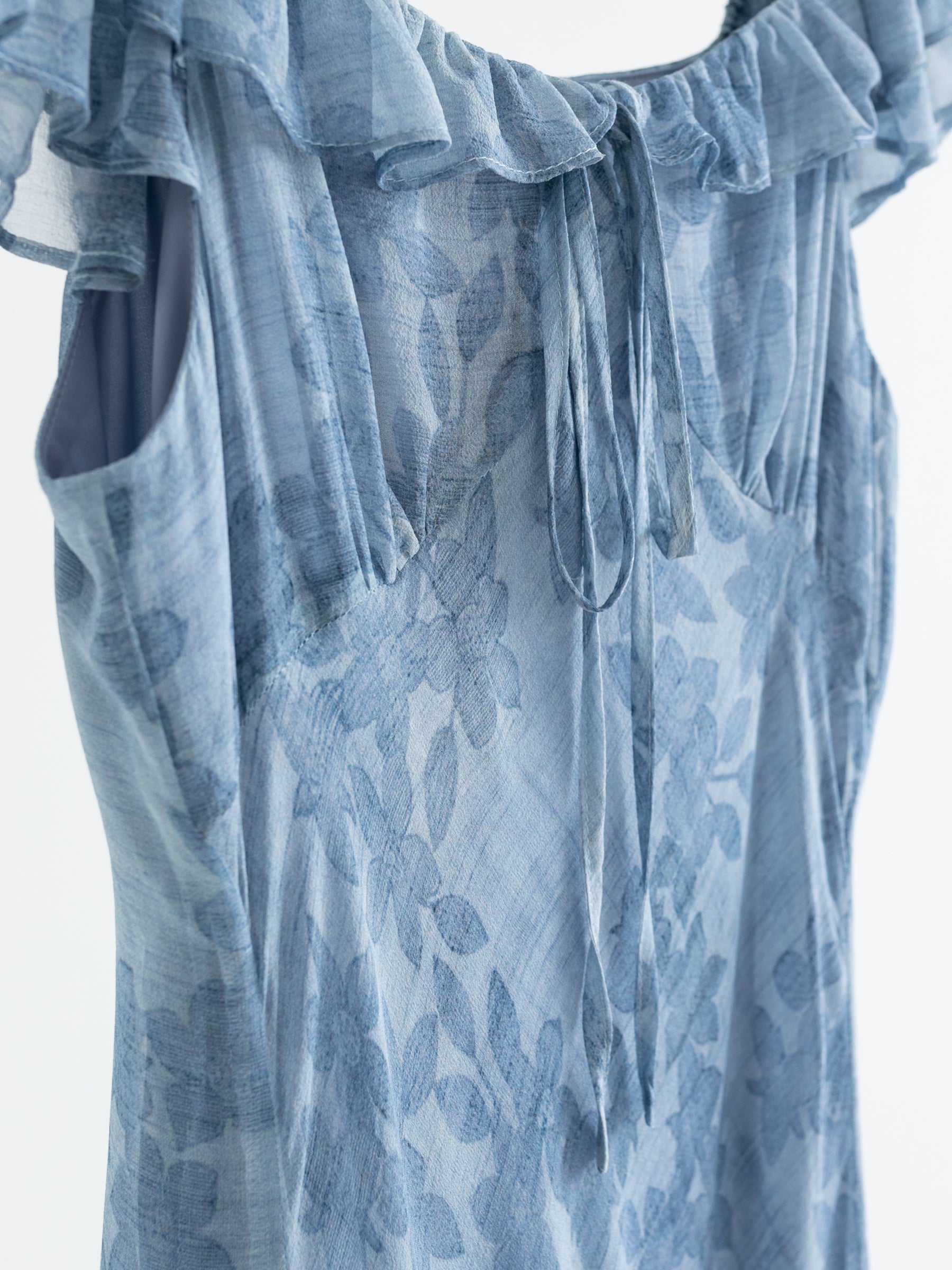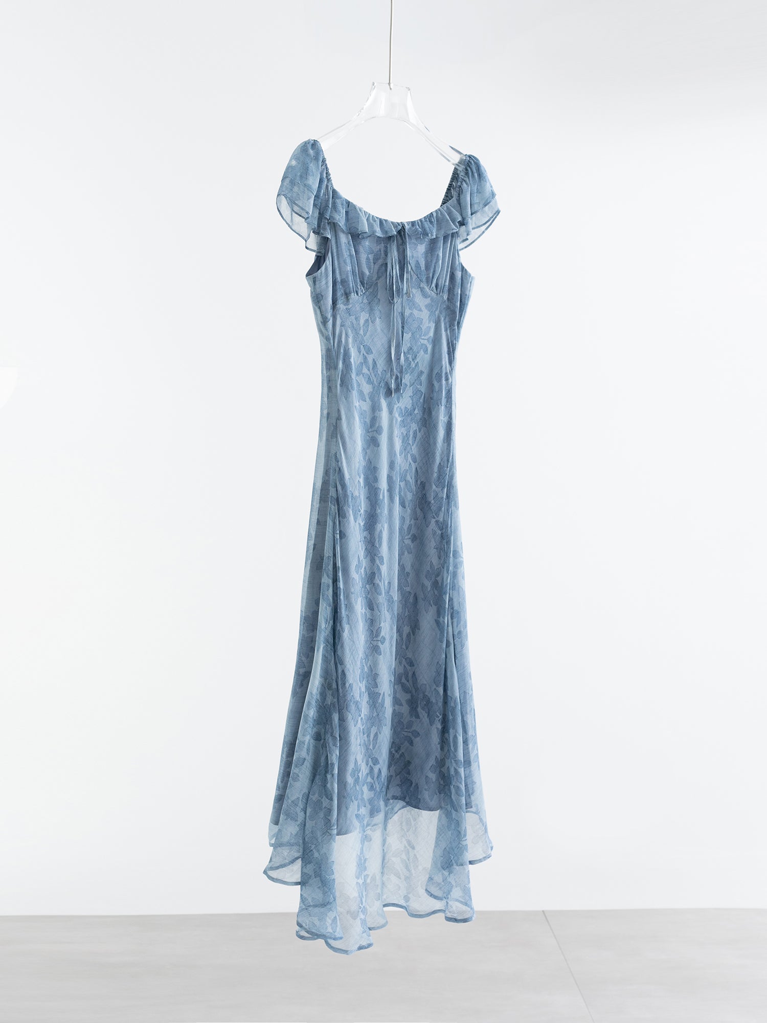A bias-cut maxi dress crafted from 100% mulberry silk, designed for a graceful drape and natural flow. The lightweight fabric offers breathable comfort, while the ruffled tie neckline adds a romantic touch. Presented in a misty sea blue with subtle floral jacquard, this dress blends elegance with ease — perfect for summer days, seaside vacations, or refined gatherings.