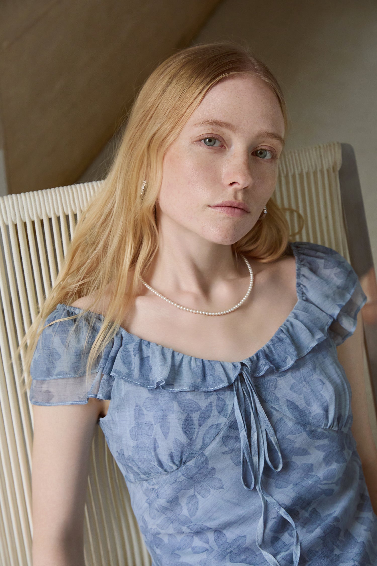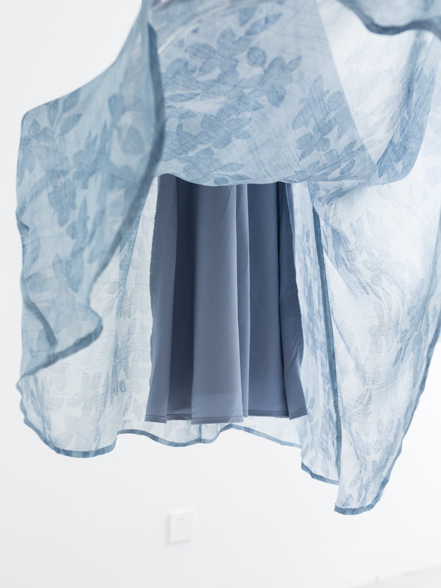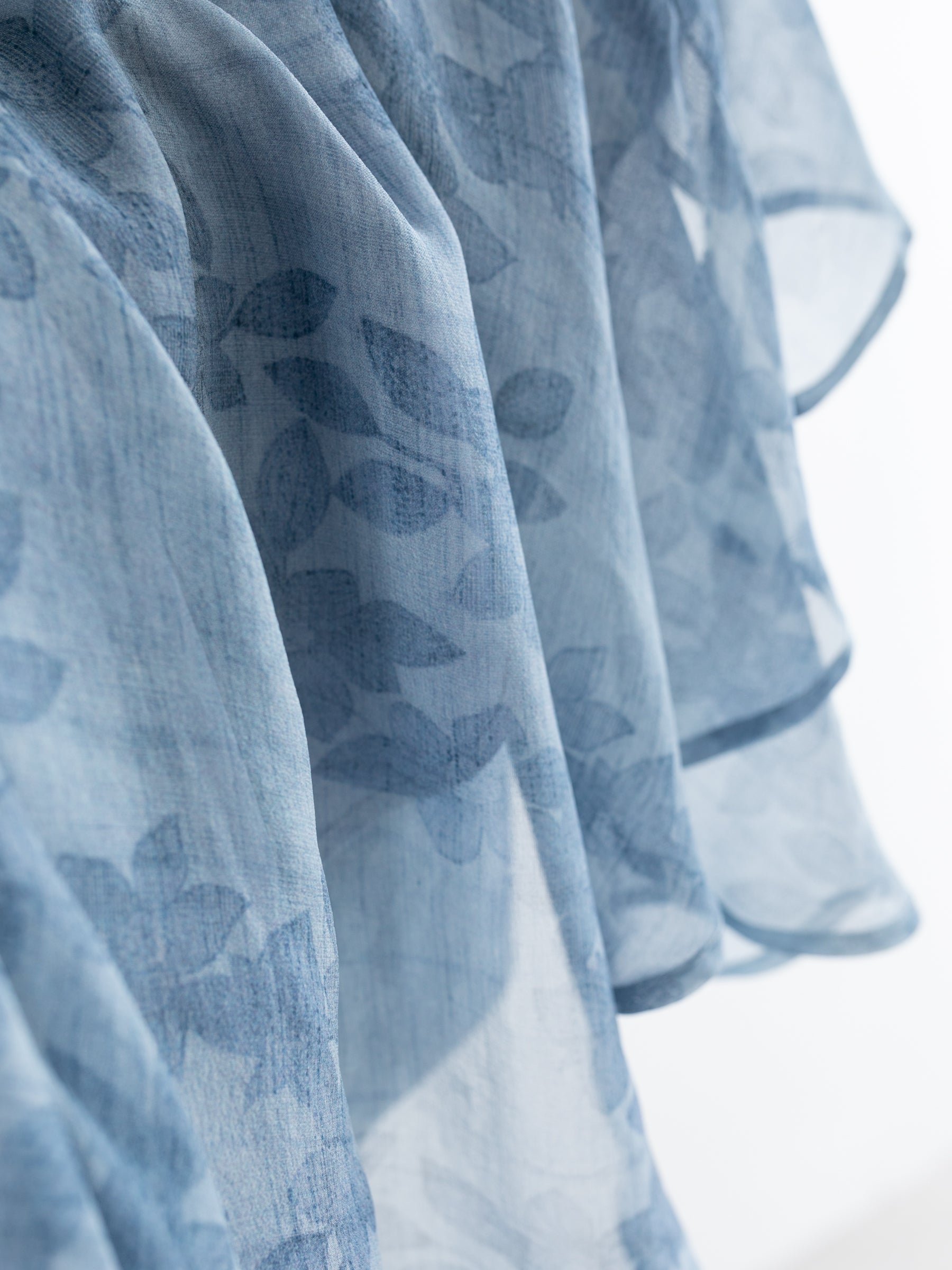 A bias-cut maxi dress crafted from 100% mulberry silk, designed for a graceful drape and natural flow. The lightweight fabric offers breathable comfort, while the ruffled tie neckline adds a romantic touch. Presented in a misty sea blue with subtle floral jacquard, this dress blends elegance with ease — perfect for summer days, seaside vacations, or refined gatherings.