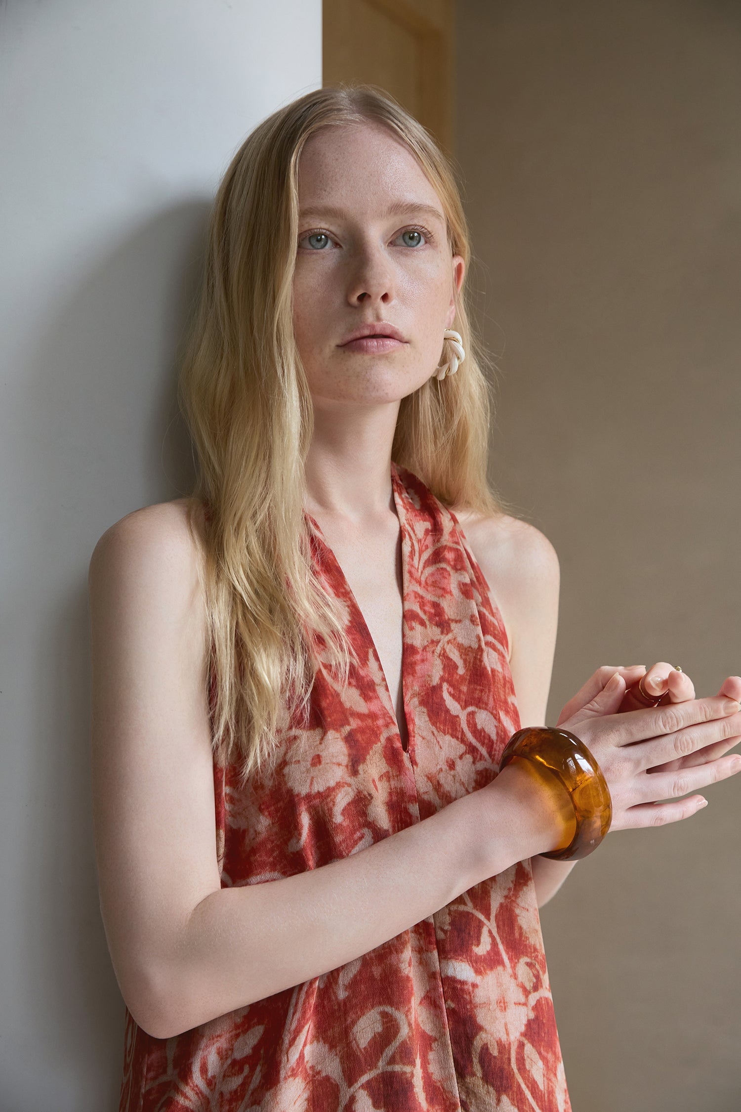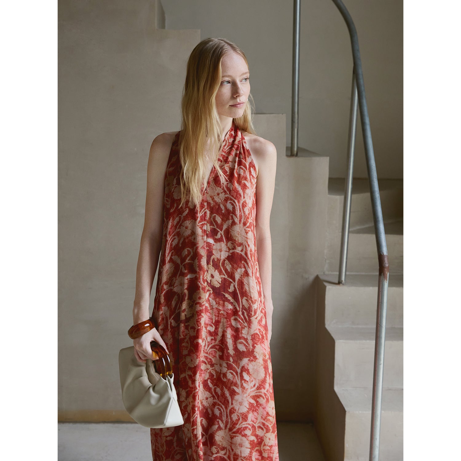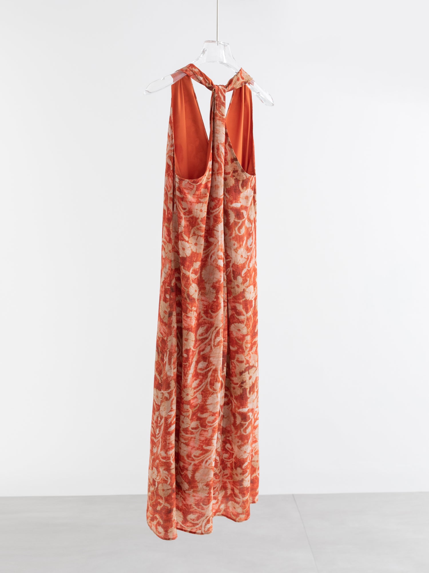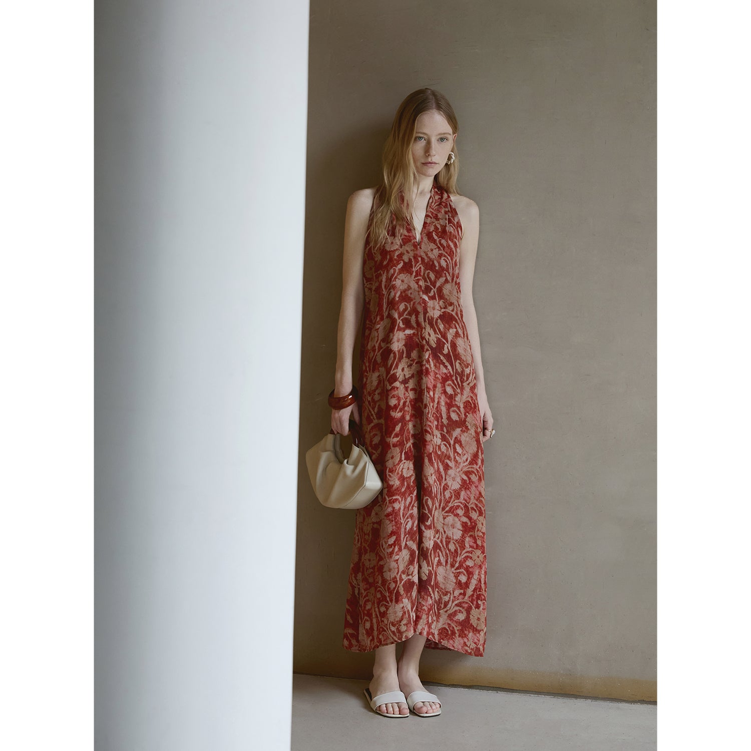 A lightweight silk halter maxi dress featuring an all-over floral motif. The halter neckline flatters the shoulders and neck, while the relaxed silhouette drapes beautifully for effortless elegance. Perfect for everyday wear, vacations, and summer gatherings.