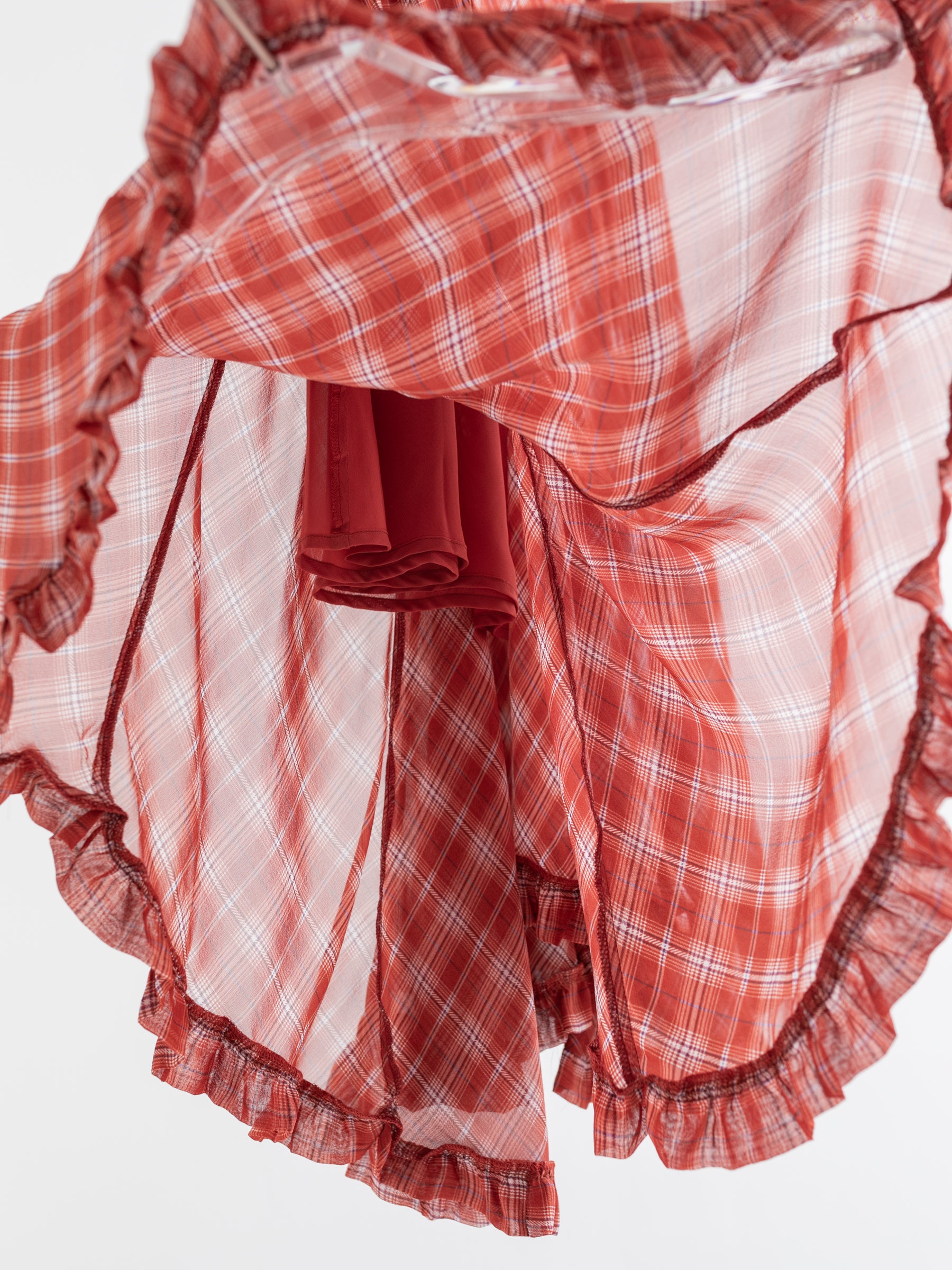 A 100% mulberry silk plaid midi skirt cut on the bias for an elegant drape and fluid movement. Finished with a softly layered ruffled hem for a romantic touch. Lightweight and smooth in a refined Hyacinth Red palette—easy to style with tees, knits, or shirts all year round.
