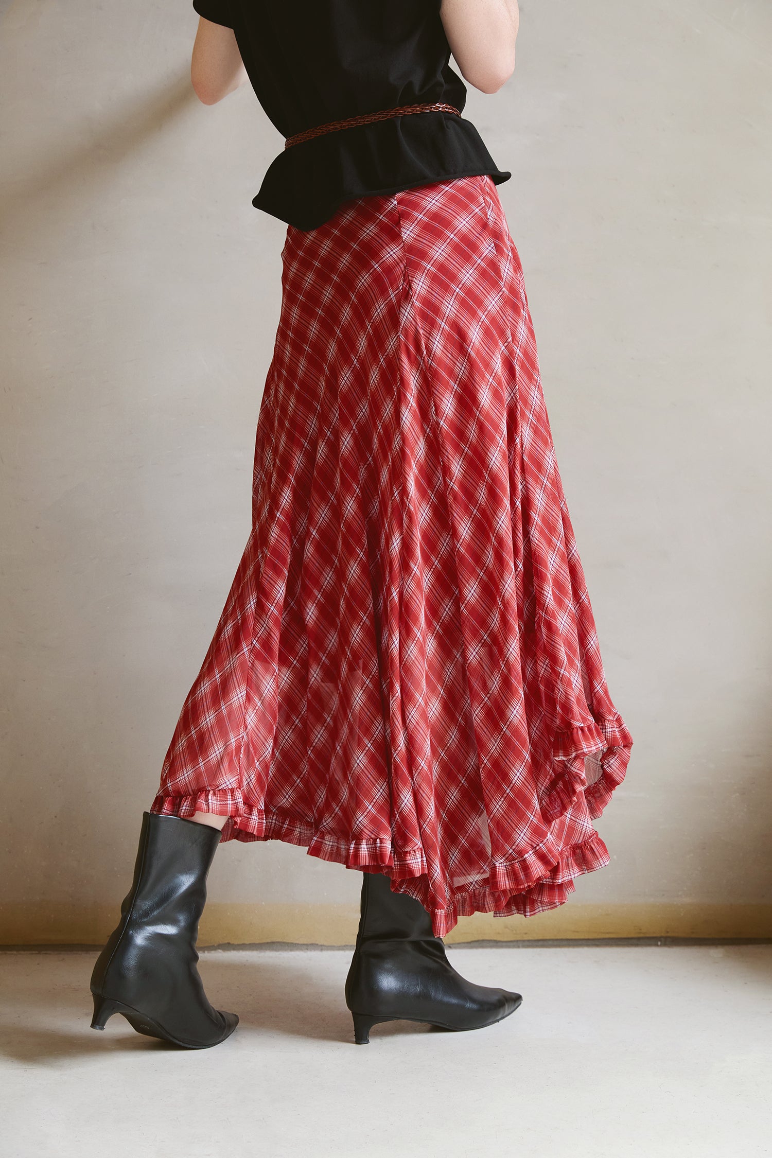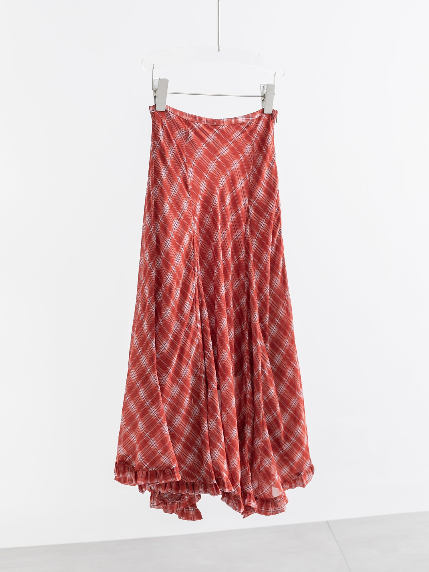 Silk Plaid Bias-Cut Ruffle Midi Skirt V011