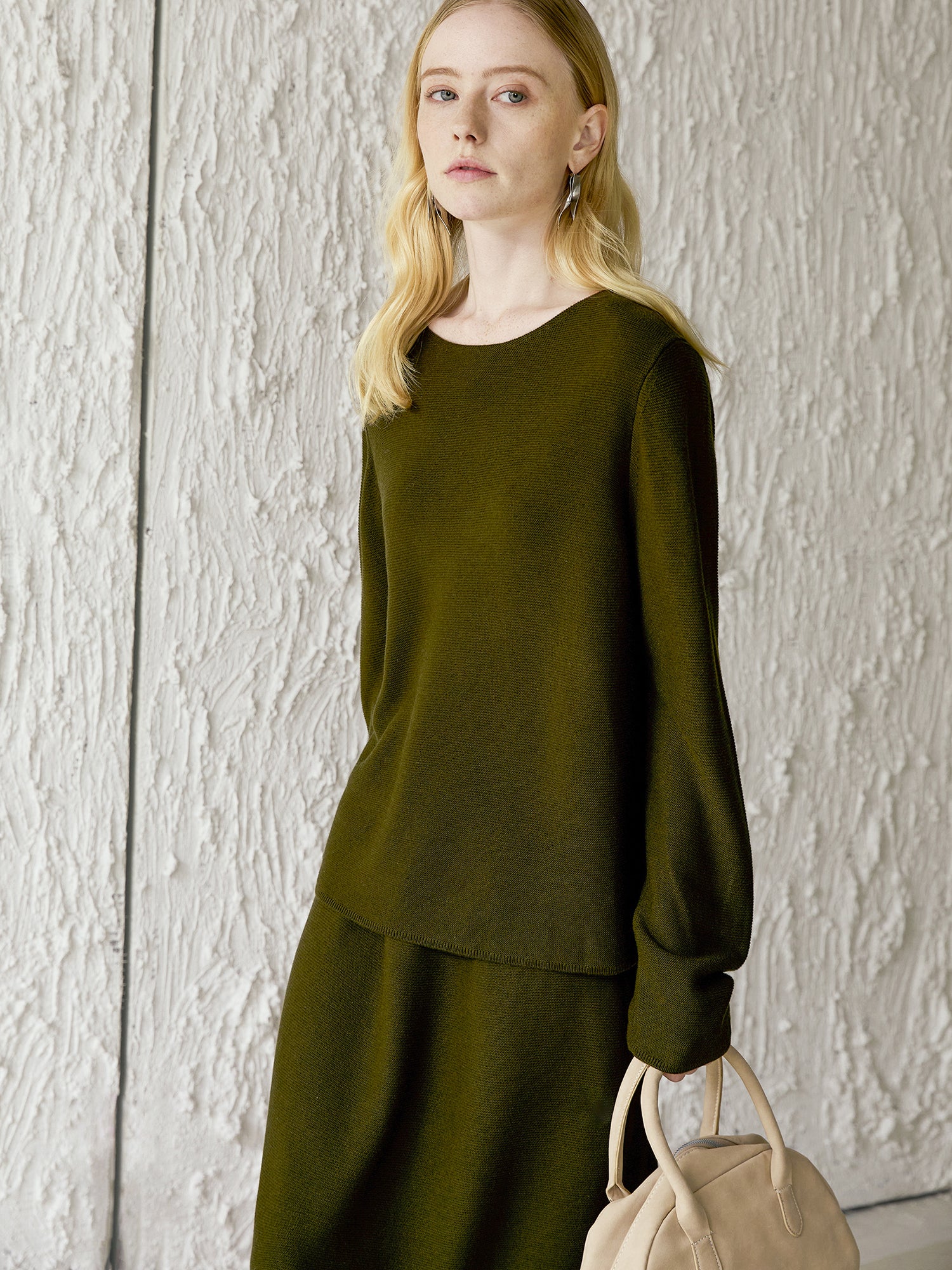Silk–Wool Boat-Neck Knit Set — Long-Sleeve Top & Midi Skirt in Moss Gree V025