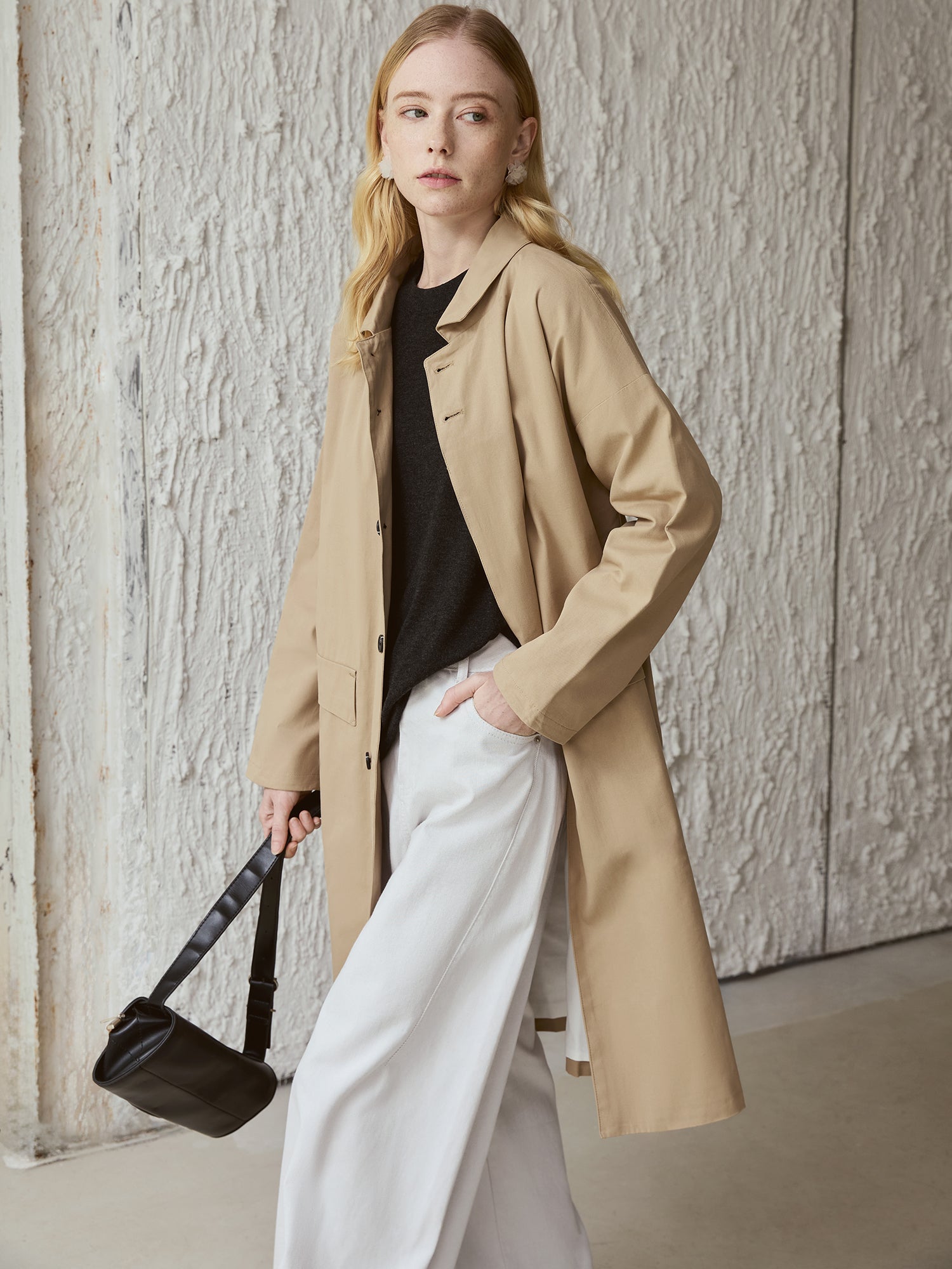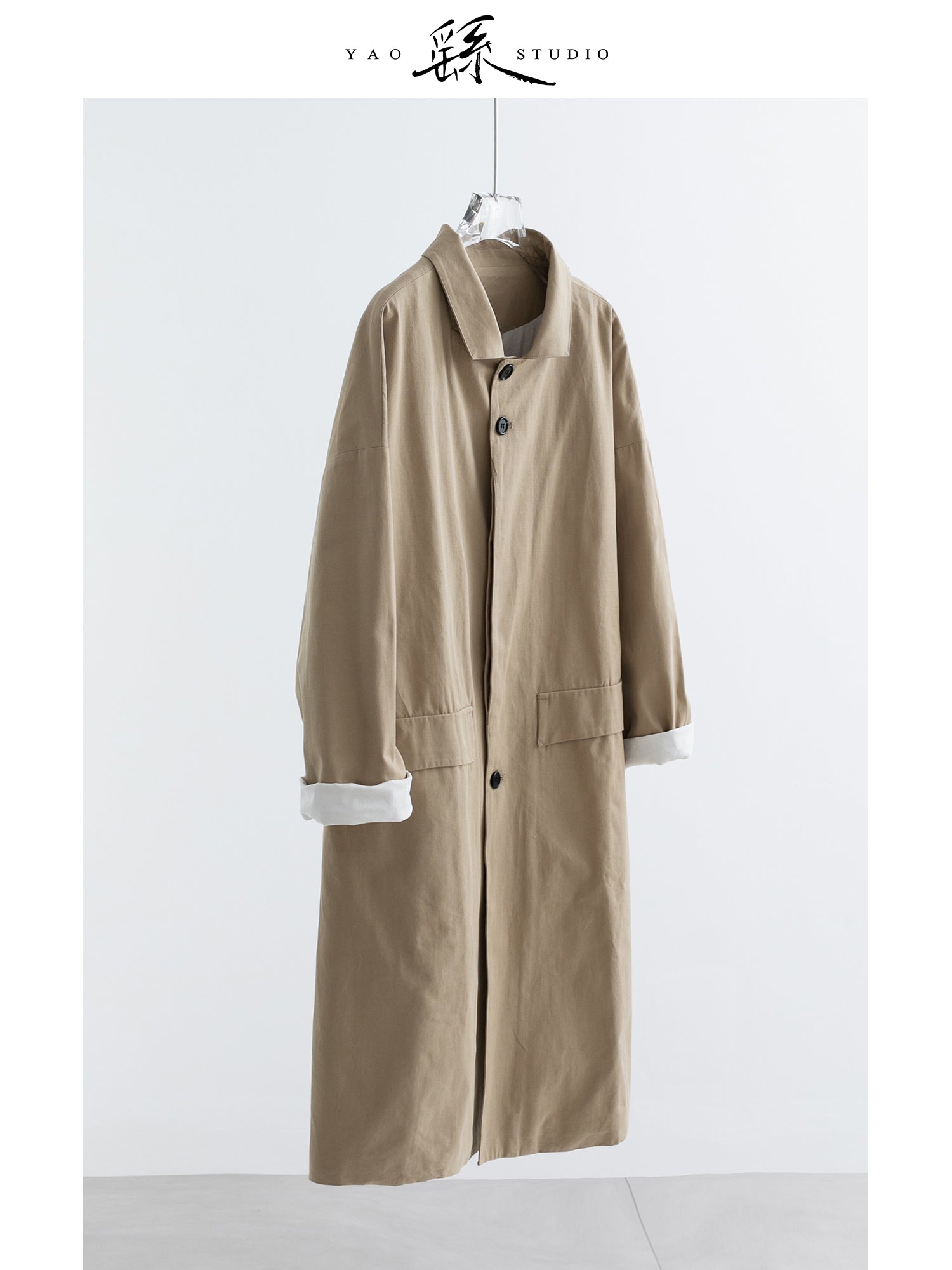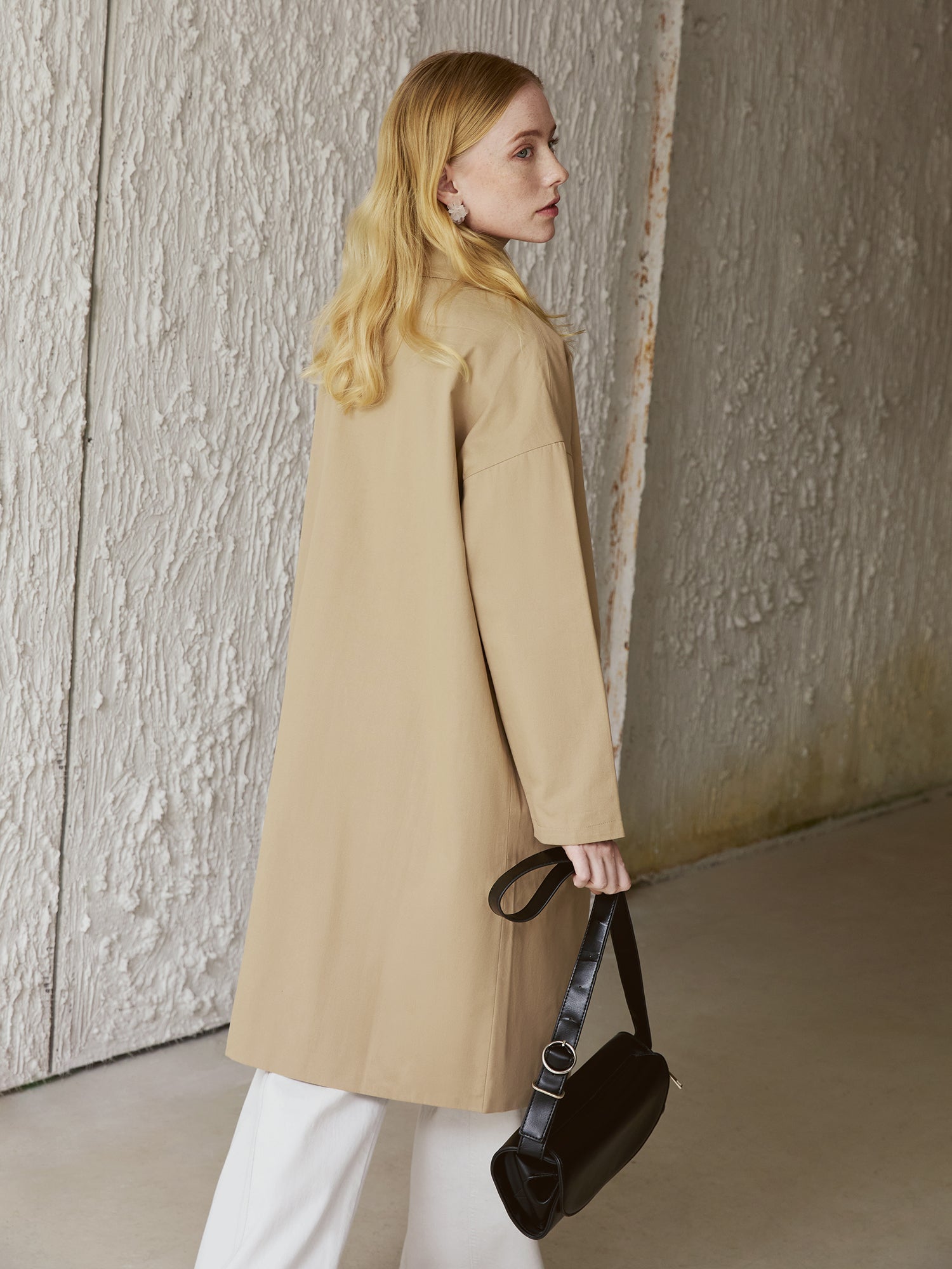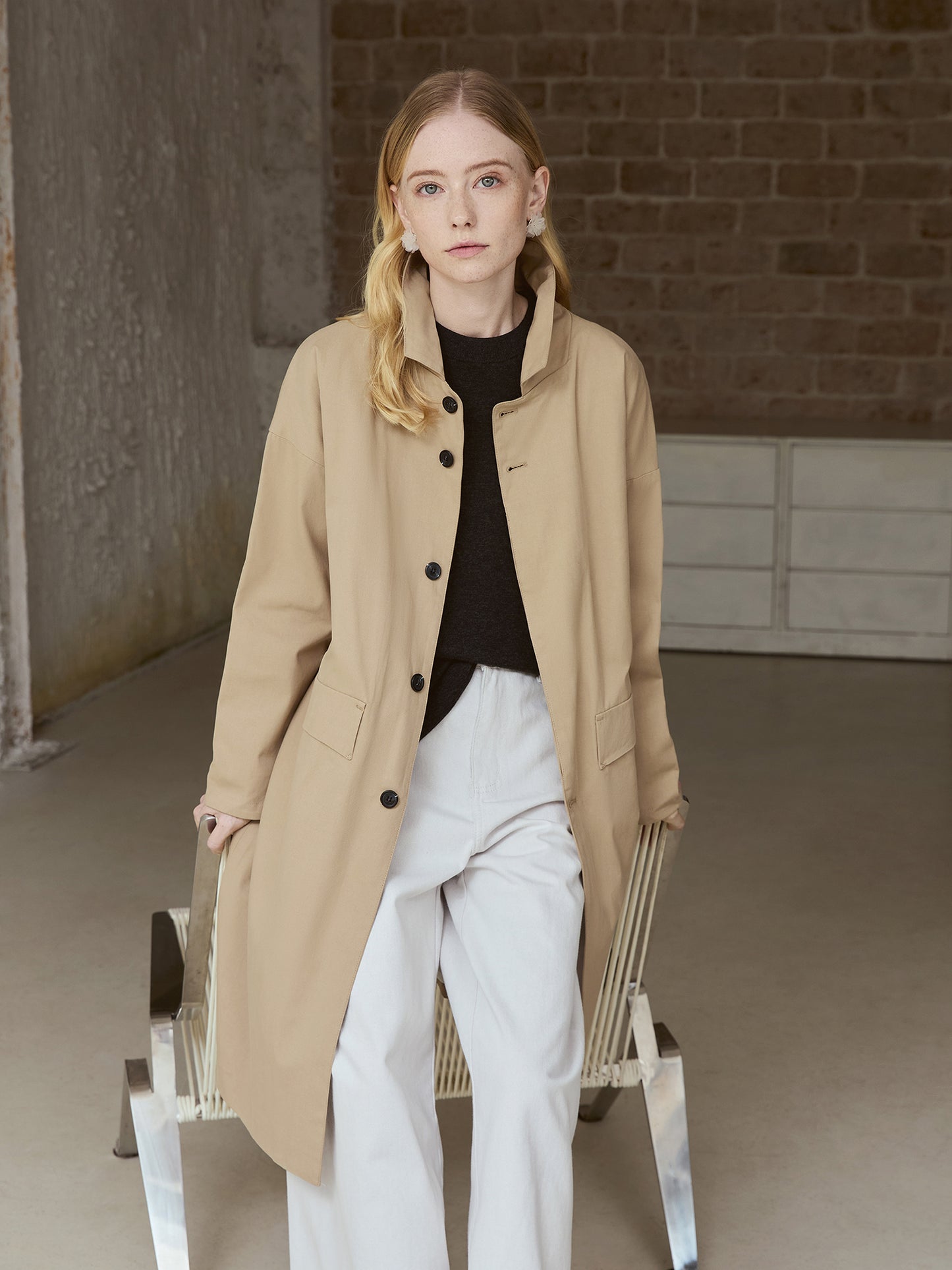 A pared-back car coat cut from supple Japanese cotton with an easy cocoon silhouette. The clean, single-breasted front and softly structured collar keep the lines modern, while dropped shoulders and roomy sleeves invite effortless layering. Inside, a rustic cotton herringbone lining adds quiet texture; turn-back cuffs reveal a hint of contrast. Deep pockets and a mid-thigh length make it the kind of throw-on you reach for from weekday commute to weekend coffee—understated, practical, and refined.