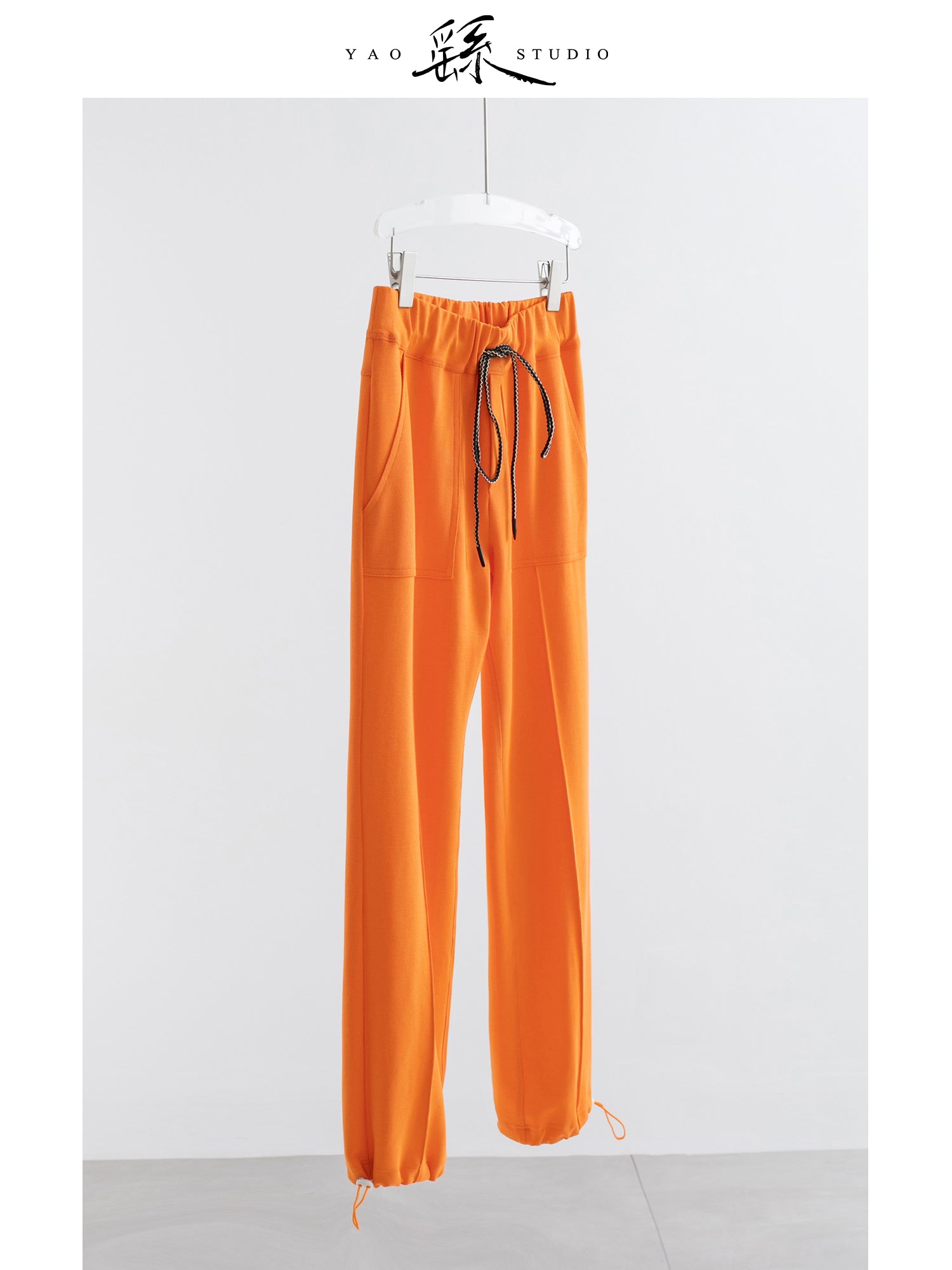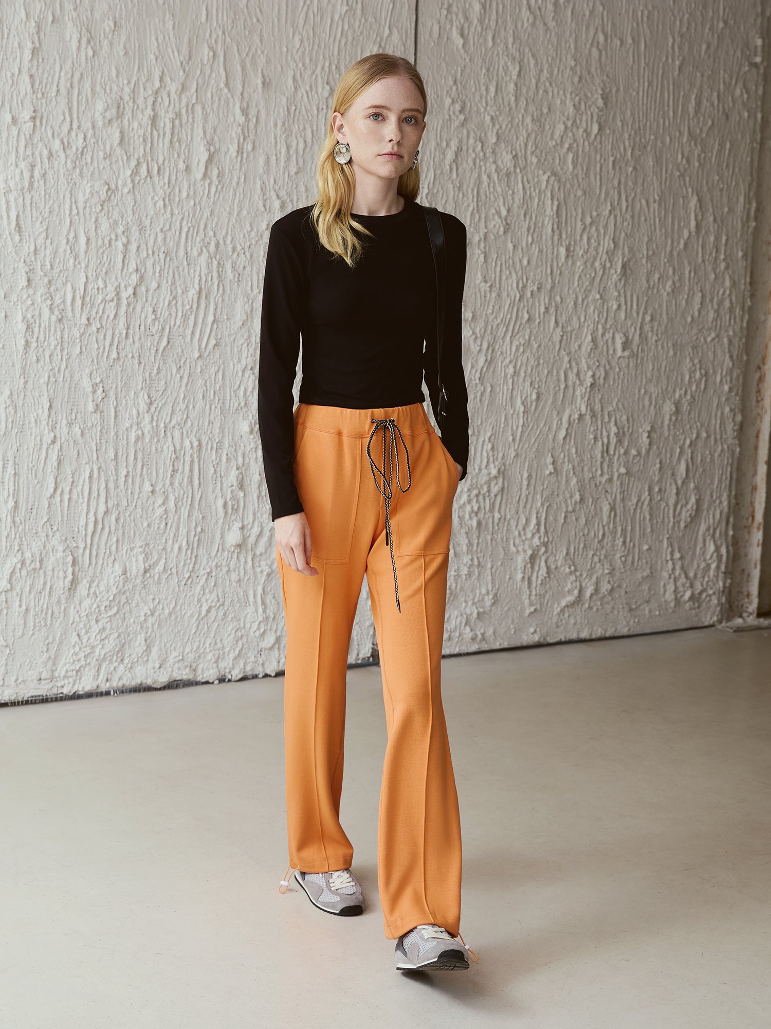 Laid-back, sport-leaning trousers cut from soft stretch cotton that drapes cleanly and moves with you. The elastic high waist is finished with a contrast drawcord and roomy front pockets; straight legs fall with an easy line and feature adjustable bungee hems so you can wear them loose or cinched like joggers. Dress them up with a neat knit, or keep it off-duty with tees and sneakers—comfortable, breathable, and color-bright in sunrise tangerine.