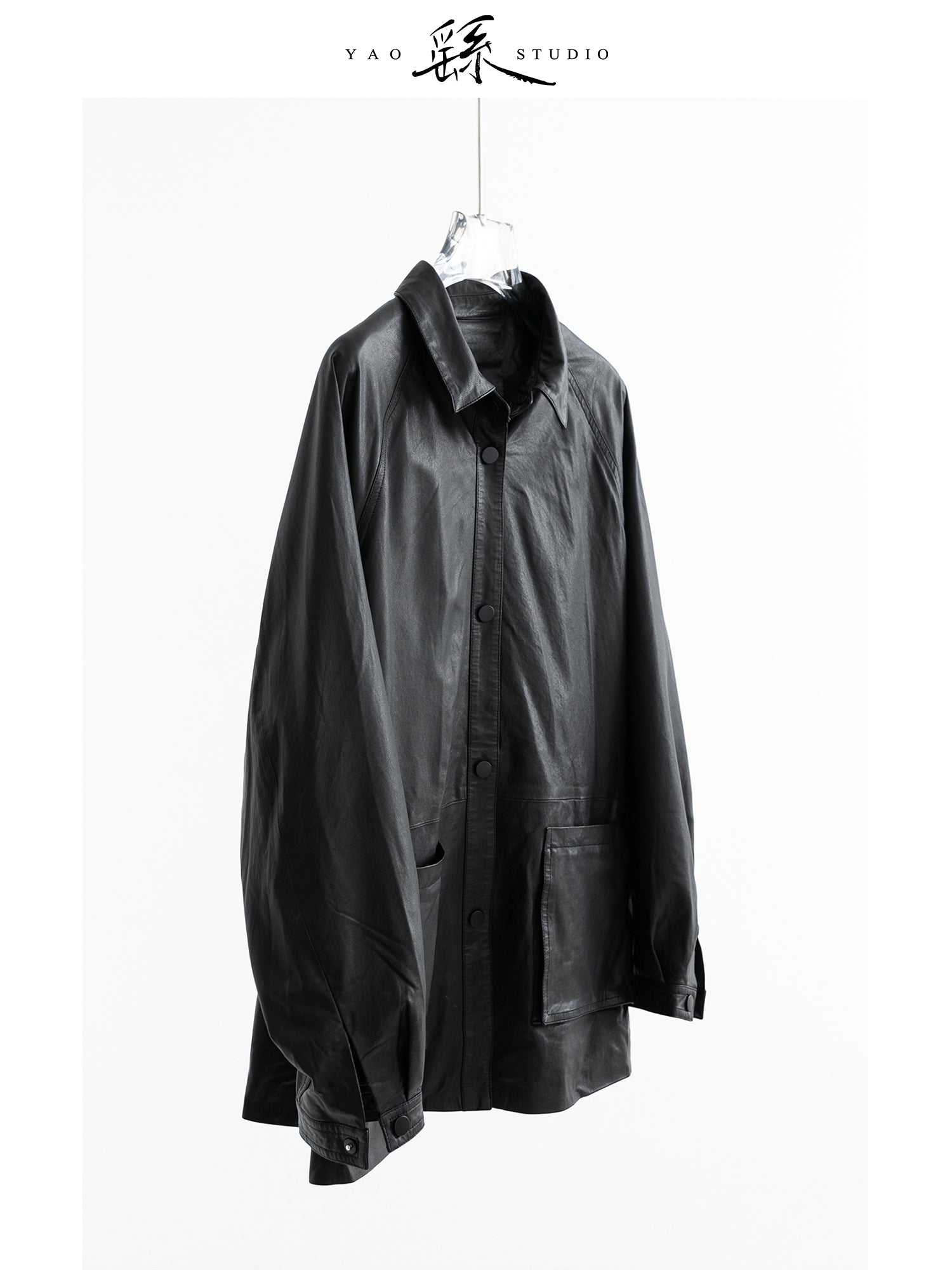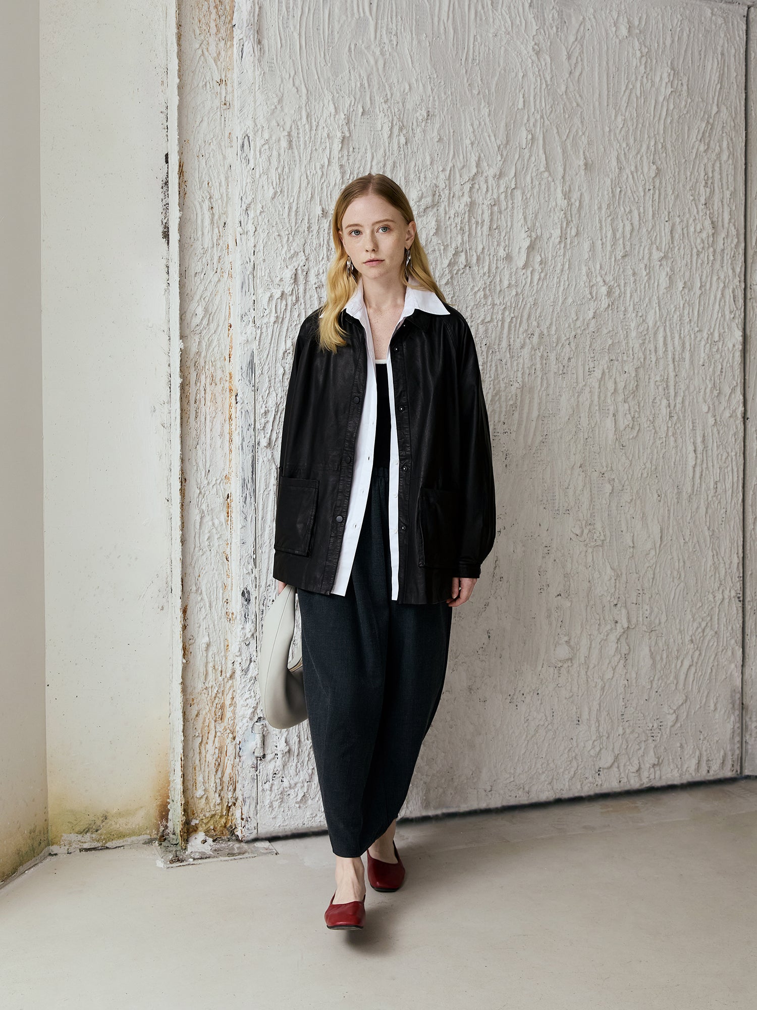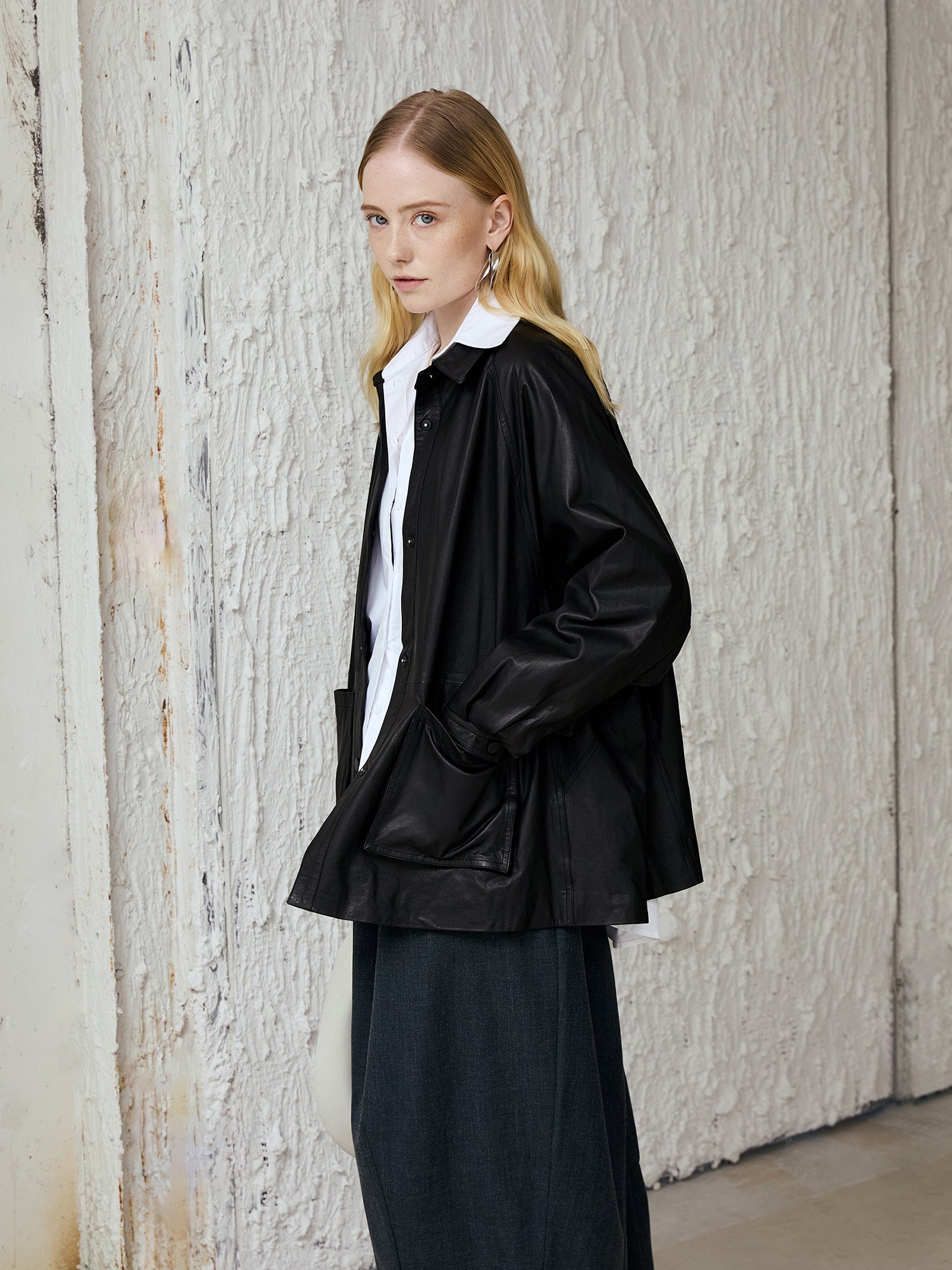 A softly structured leather overshirt you’ll live in. Cut from buttery plant-tanned lambskin, this jacket drapes with an easy, oversized silhouette for effortless layering. A pointed collar, raglan sleeves and a snap-front closure keep the look clean; generous patch pockets add attitude and utility. The matte, velvety finish reads refined but relaxed—perfect with denim, tailoring, or a slip dress.